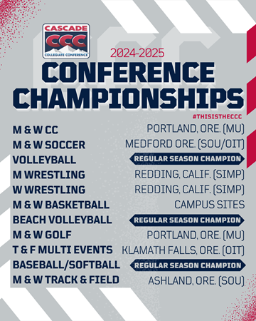 CORVALLIS, Ore. – Sixteen Cascade Collegiate Conference (CCC) championships, presented by U.S. Bank, will be contested during the 2024-25 athletic year, the conference office announced today.